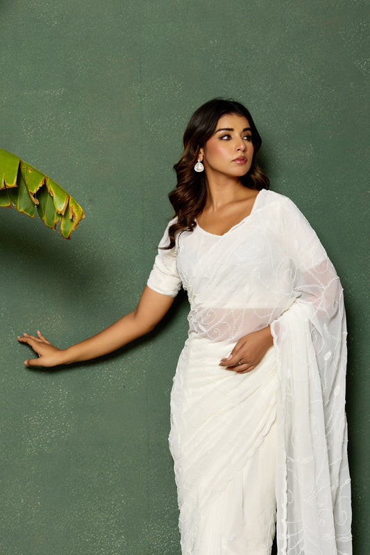 GEORGETTE IVORY KARDANA JAAL HANDWORK SAREE BY SKFBHOLUBHAI