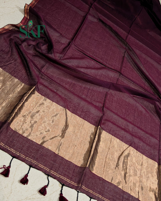 COTTON PLAIN WEAVING PALLU WINE & BRONZE SAREE BY SKF...