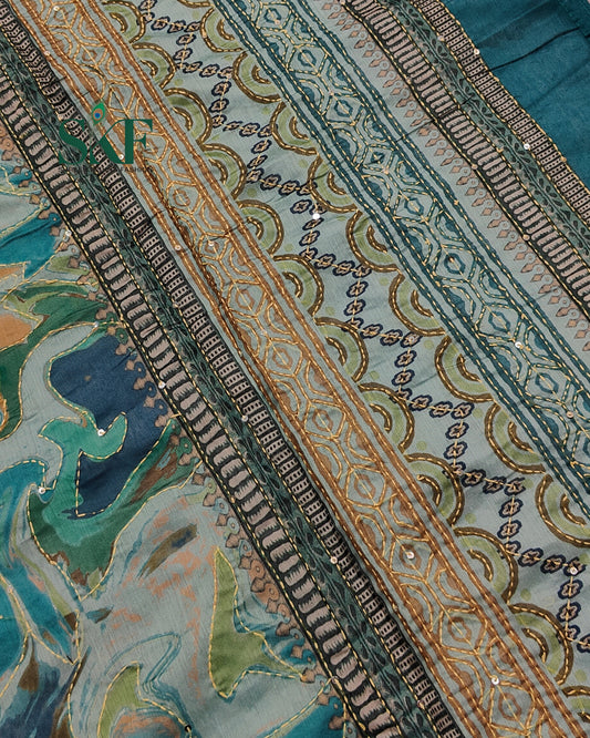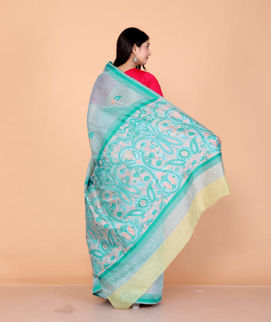 CHANDERI COTTON BRUSH PRINT KHATHA WORK TEAL BLUE SAREE B...