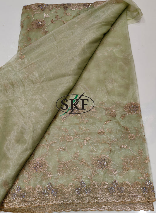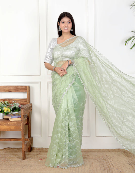 ORGANZA SILVER KRDANA HANDWORK JAAL PISTA GREEN SAREE BY ...