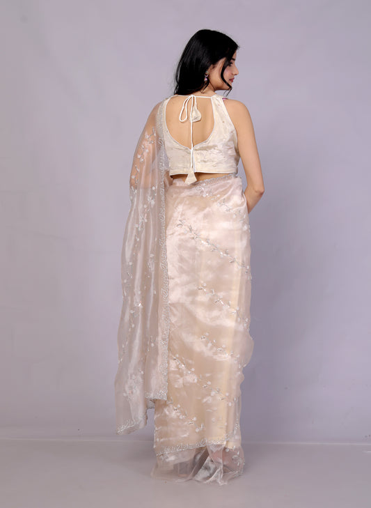 GLOSSY ORGANZA BEATS HANDWORK JAAL IVORY GOLD SAREE BY SK...
