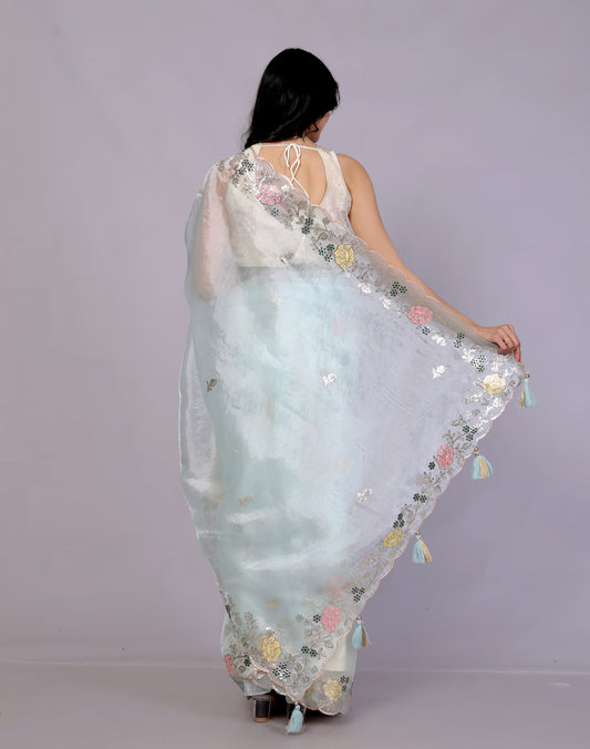 GLOSSY ORGANZA MULTI ZARI EMBROIDERY SKY BLUE SAREE BY SK...