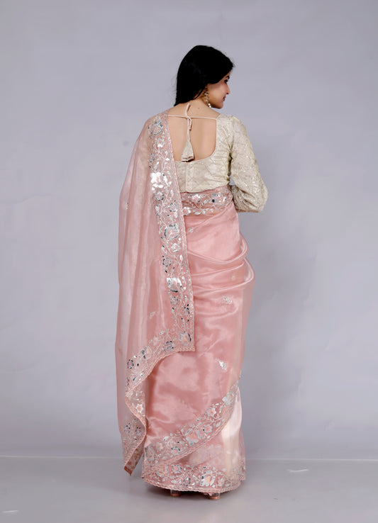GLOSSY TISSUE ZARI EMBROIDERY BORDER PEACH SAREE BY SKFB...
