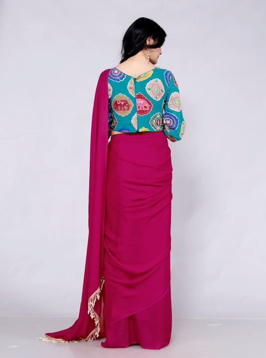 CREPE PLAIN TASSELS WORK RANI PINK SAREE BY SKFBHOLUBHAI