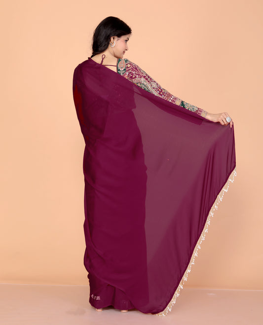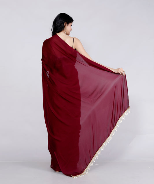 CREPE PLAIN TASSELS WORK MAHROON SAREE BY SKFBHOLUBHAI