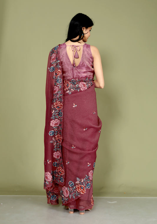 GLOSSY TISSUE ZARI EMBROIDERY BORDER PEACH SAREE BY SKFB...