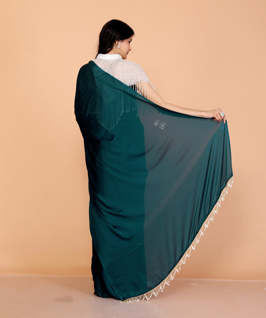CREPE PLAIN TASSELS WORK TURQUOISE GREEN SAREE BY SKFBHOL...