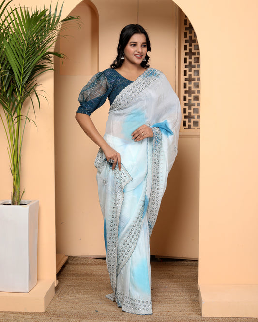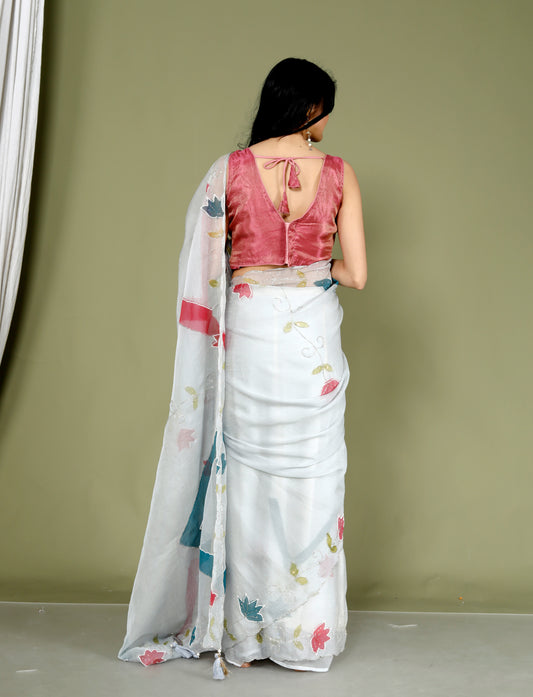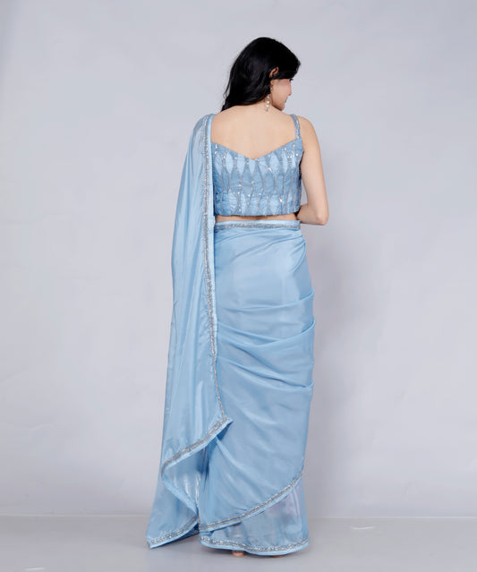 SATIN SILK HANDWORK BORDER STICH BLOUSE ICE BLUE SAREE BY...