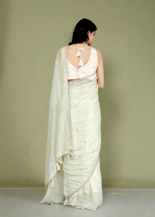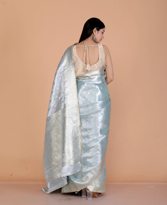 TISSUE SILK BUTTY WEAVING ICE BLUE SAREE BY SKFBHOLUBHAI