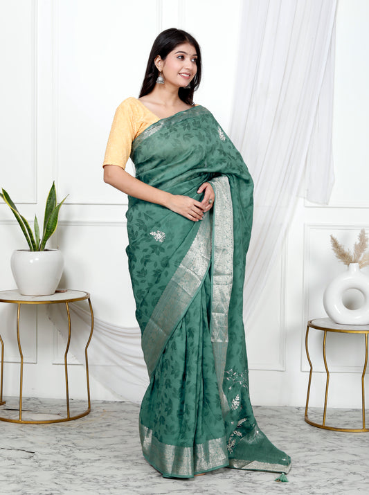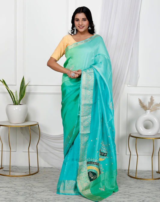 CRUSH TISSUE PERAL HANDWORK PISTA GREEN SAREE BY SKFBHOLU...