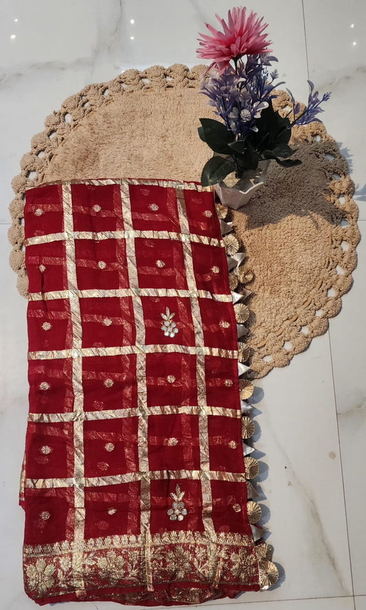 JAIPURI CHINON WITH KACHHA GOTA WORK GHEVAR BANDHEJ RED C...