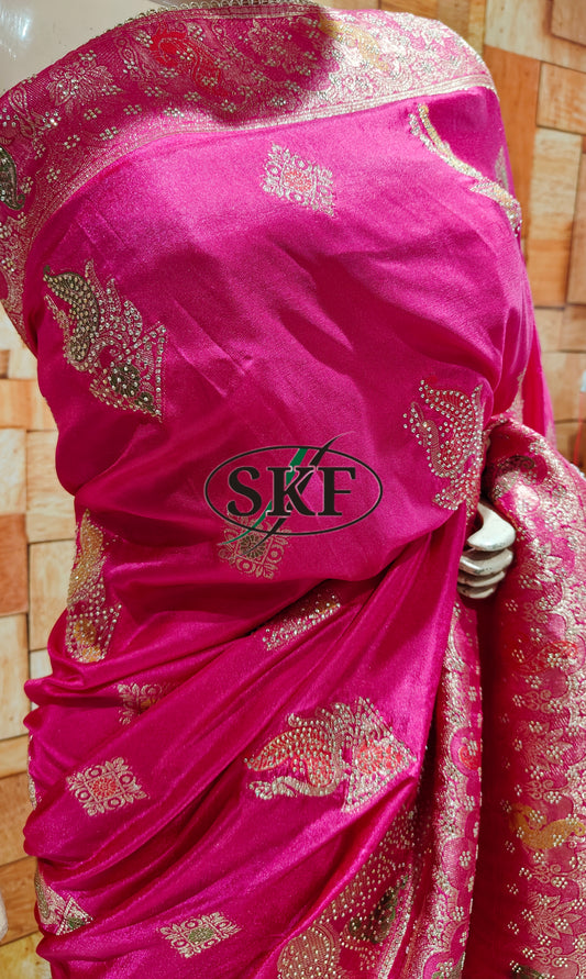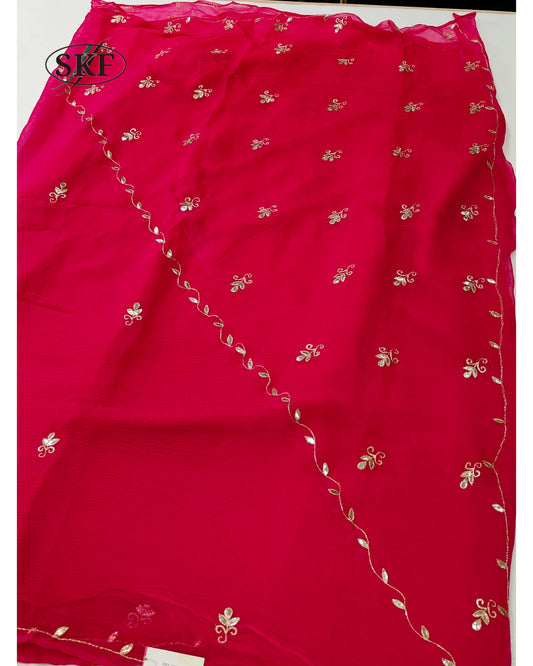 PURE CHIFFON GOTTAPATTI AARI WORK RANI PINK SAREE BY SKFB...