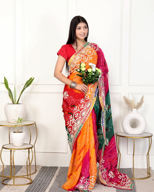 CHINON CREPE PACHRANGA BHANDHANI KACHA GOTTA WORK SAREE B...