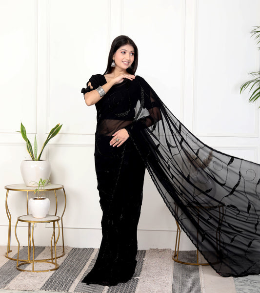 GEORGETTE BLACK KARDANA JAAL HANDWORK SAREE BY SKFBHOLUBHAI