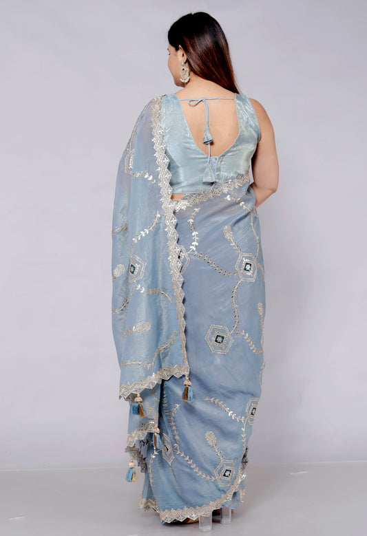 CRUSH TISSUE ZARI GOTTA EMBROIDERY JAAL ICE BLUE SAREE BY...