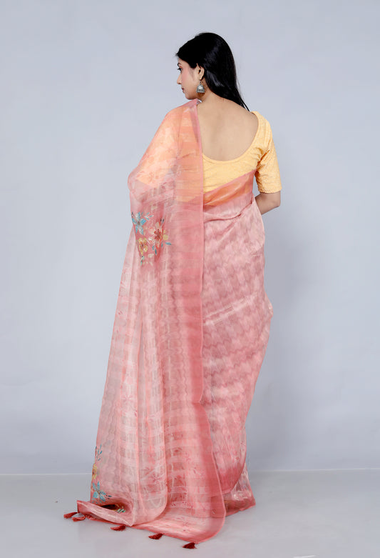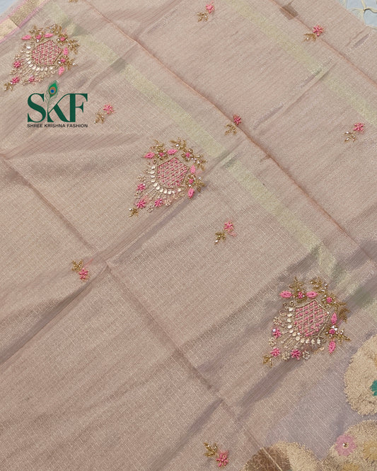 DORIYA TISSUE MULTI WEAVING HANDWORK BUTTA PEACH PINK SAR...
