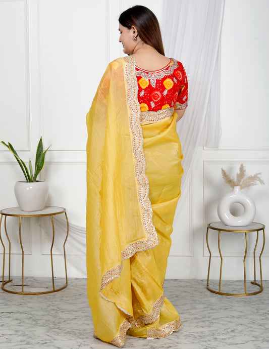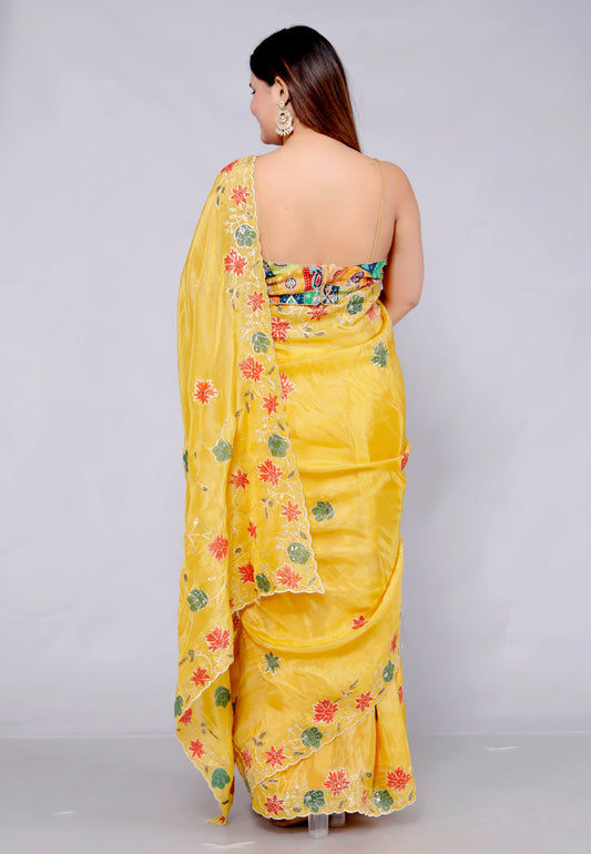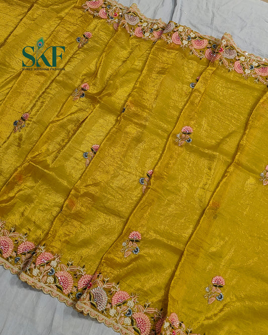 CRUSH TISSUE SIPPI SEQUENCE EMBROIDERY WORK YELLOW SAREE ...