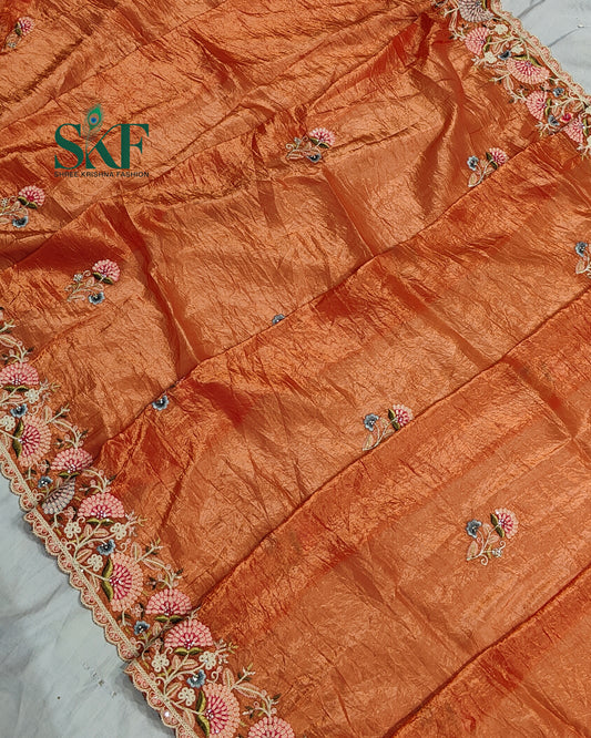 CRUSH TISSUE SIPPI SEQUENCE EMBROIDERY WORK ORANGE RUST S...