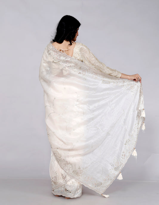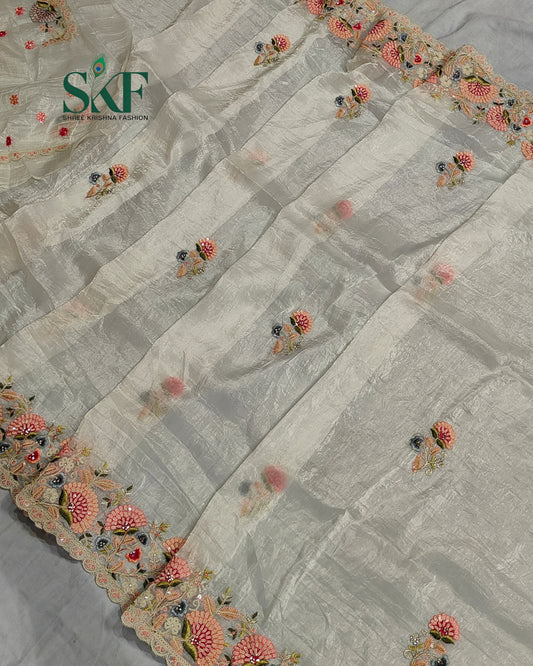CRUSH TISSUE SIPPI SEQUENCE EMBROIDERY WORK IVORY SAREE B...