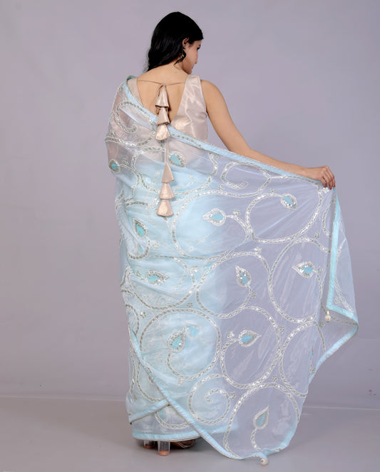 CRUSH TISSUE ZARI GOTTA EMBROIDERY JAAL ICE BLUE SAREE BY...