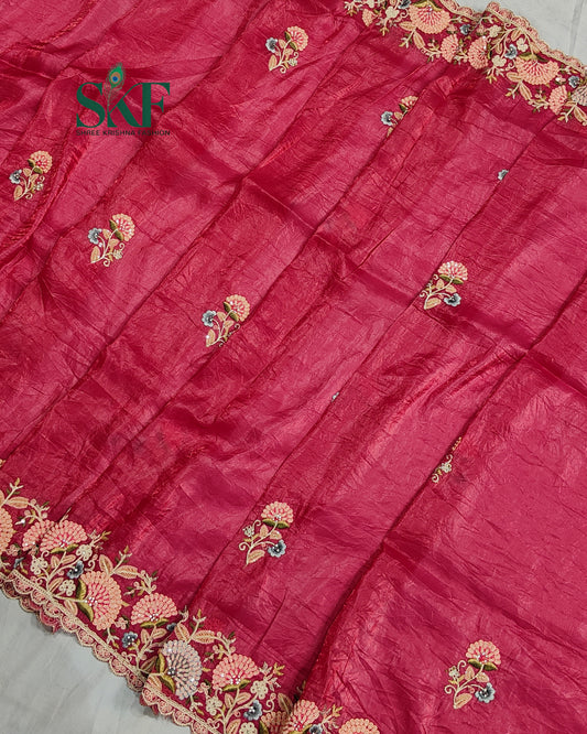 CRUSH TISSUE SIPPI SEQUENCE EMBROIDERY WORK BURGENDY SARE...
