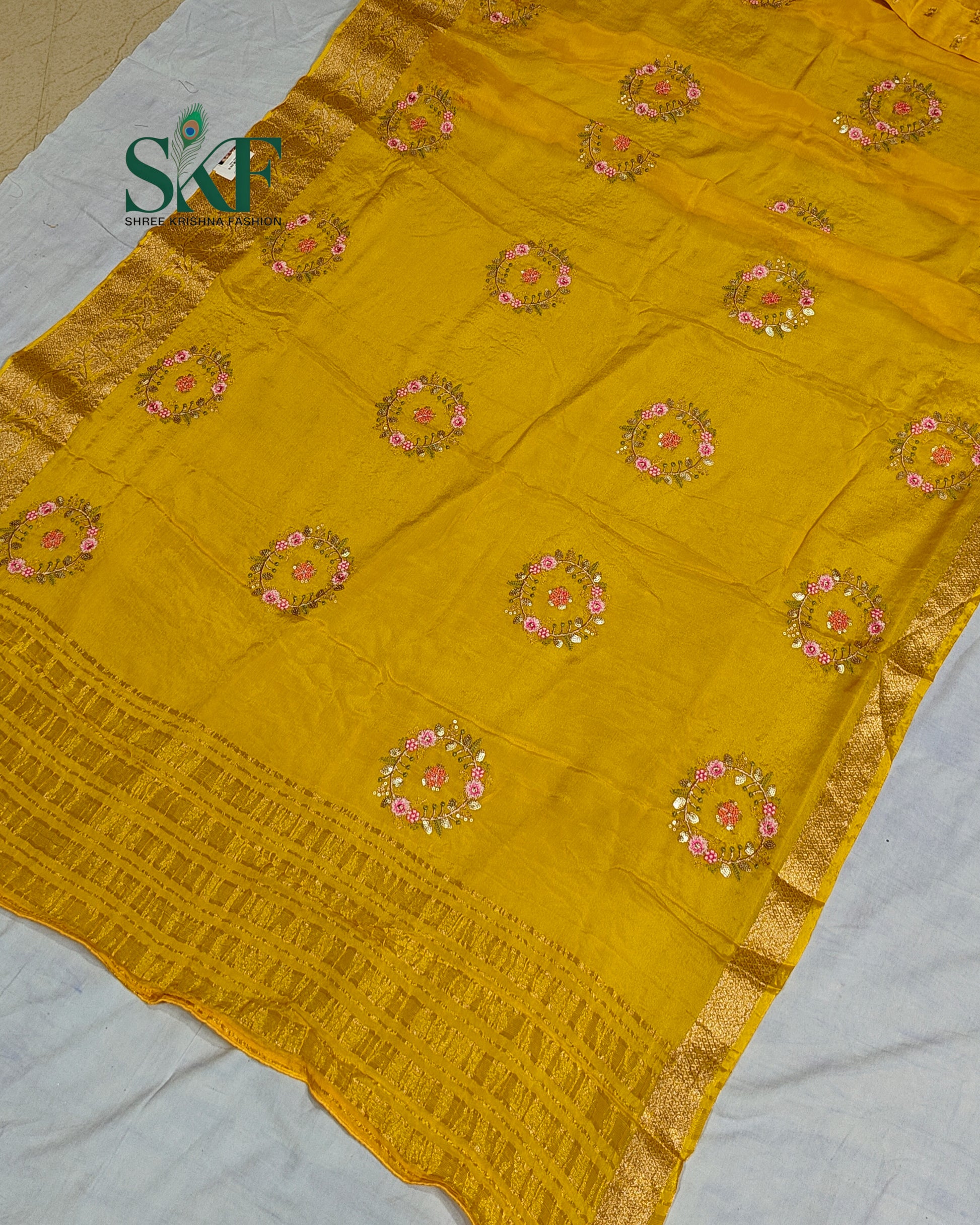 CHINON SEQUENCE EMBROIDERY WEAVING WORK YELLOW SAREE BY SKFBHOLUBHAI