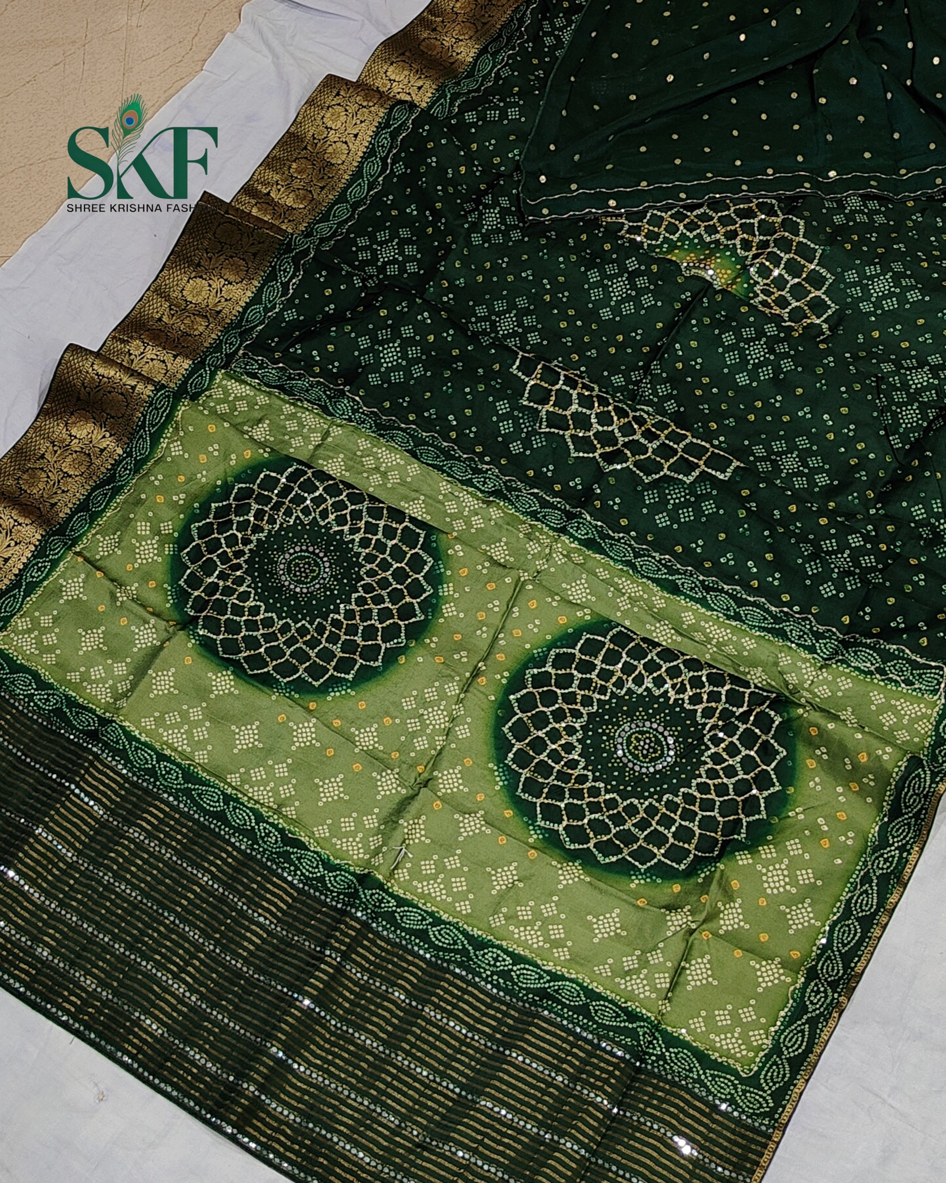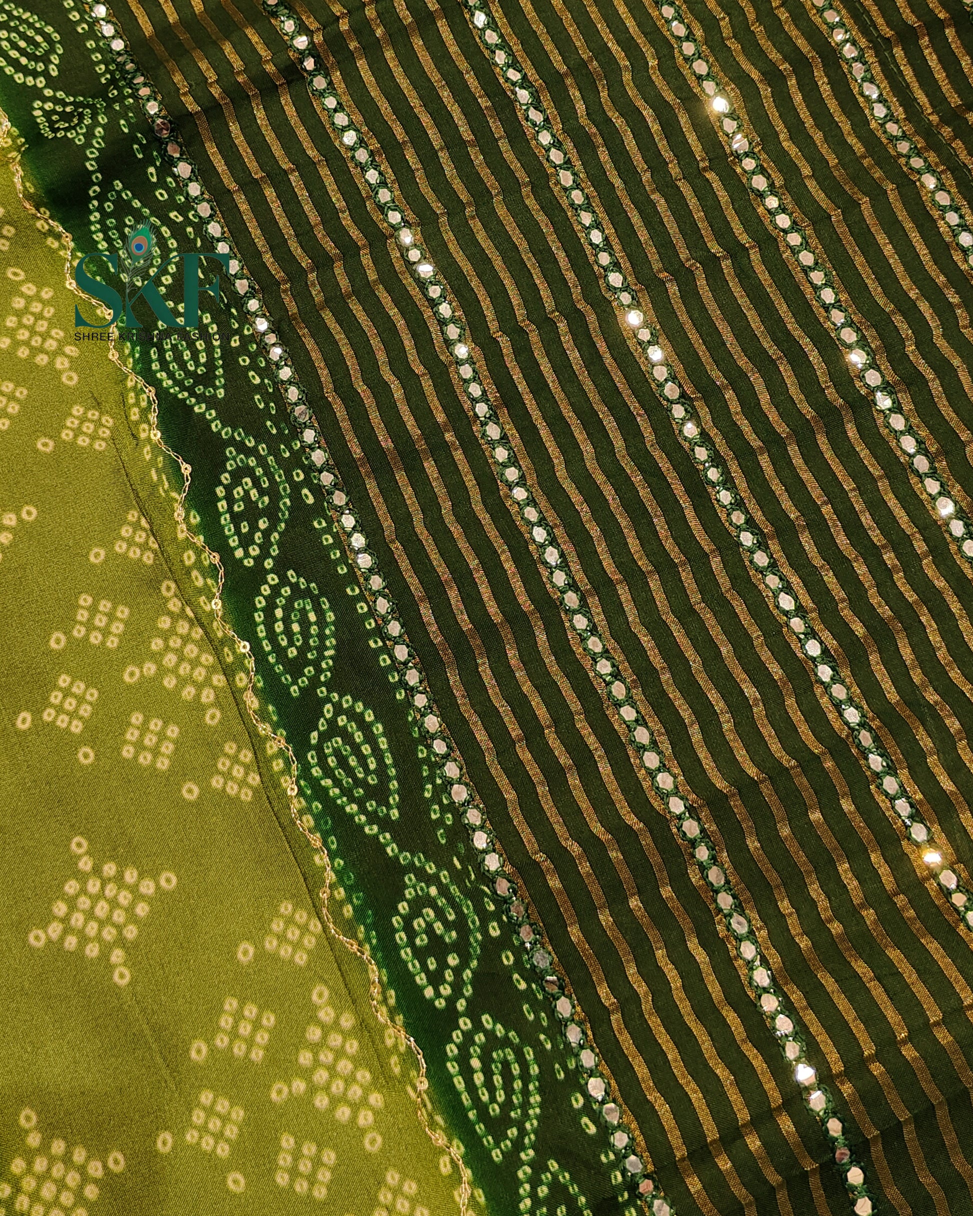 HO SILK BHANDHANI MIRROR WORK TWO TONE BOTTLE GREEN AND MEHNDI GREEN SAREE BY SKFBHOLUBHAI