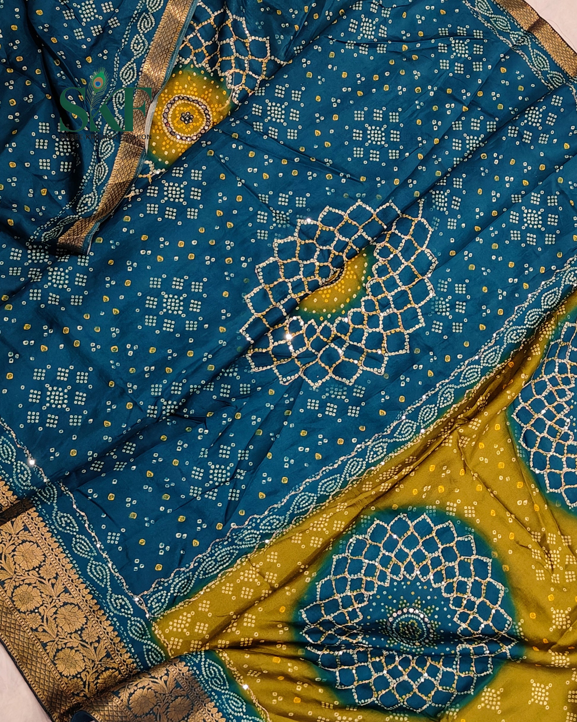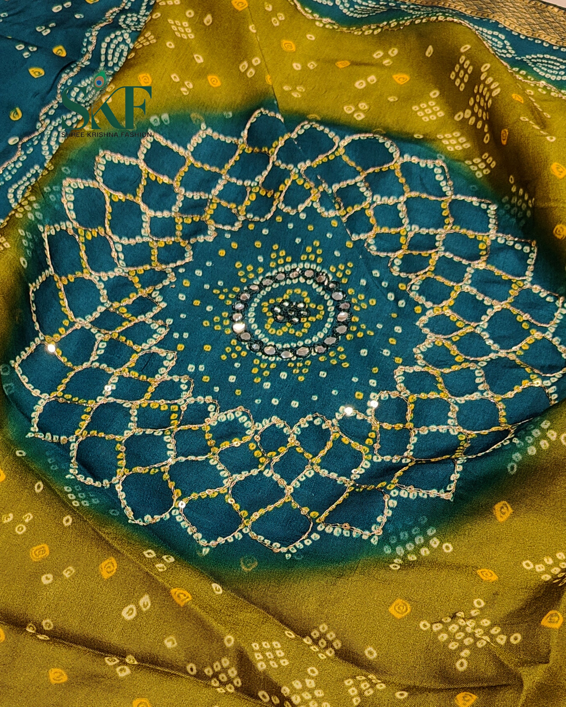 HO SILK BHANDHANI MIRROR WORK TWO TONE TEAL BLUE AND MEHNDI GREEN SAREE BY SKFBHOLUBHAI