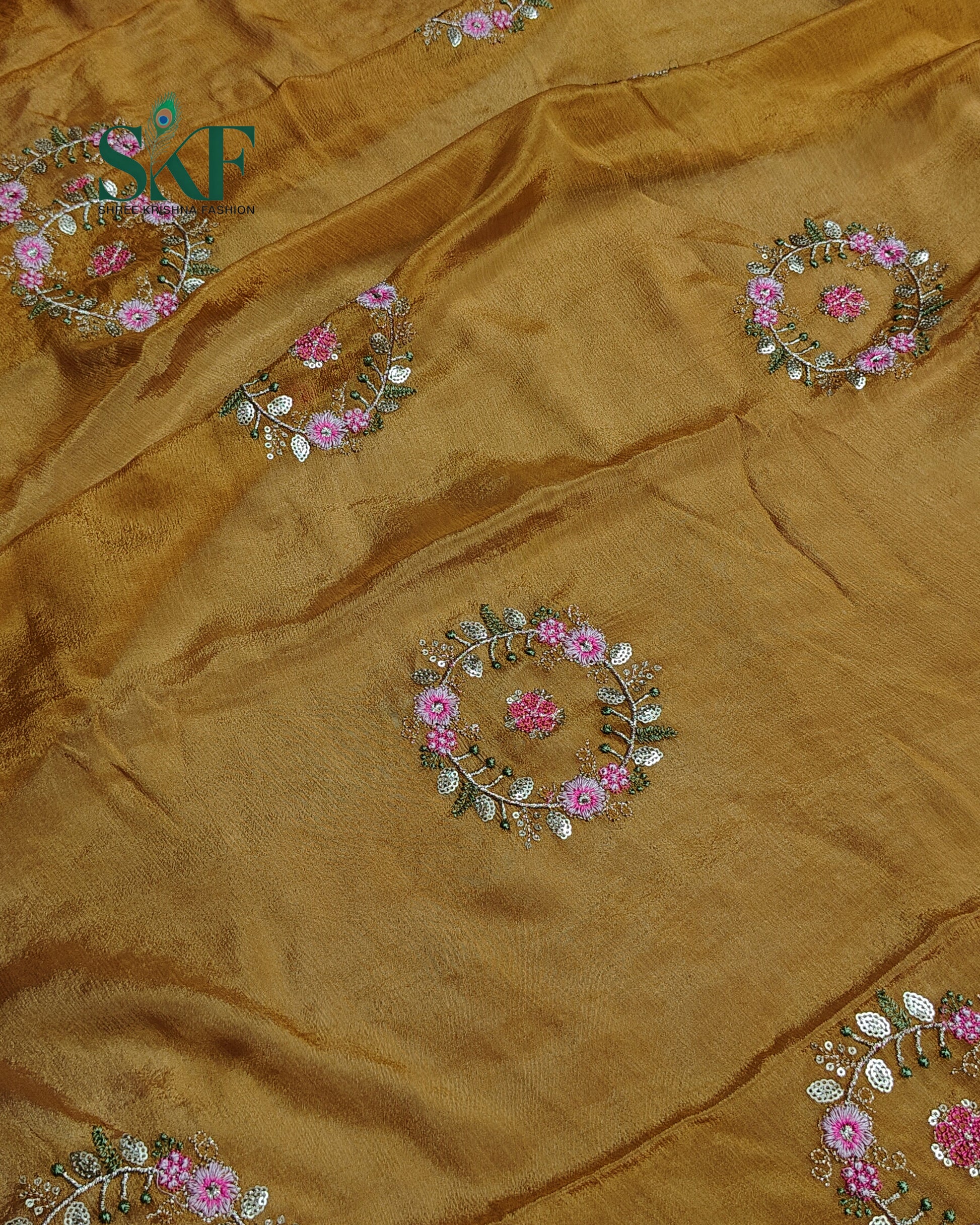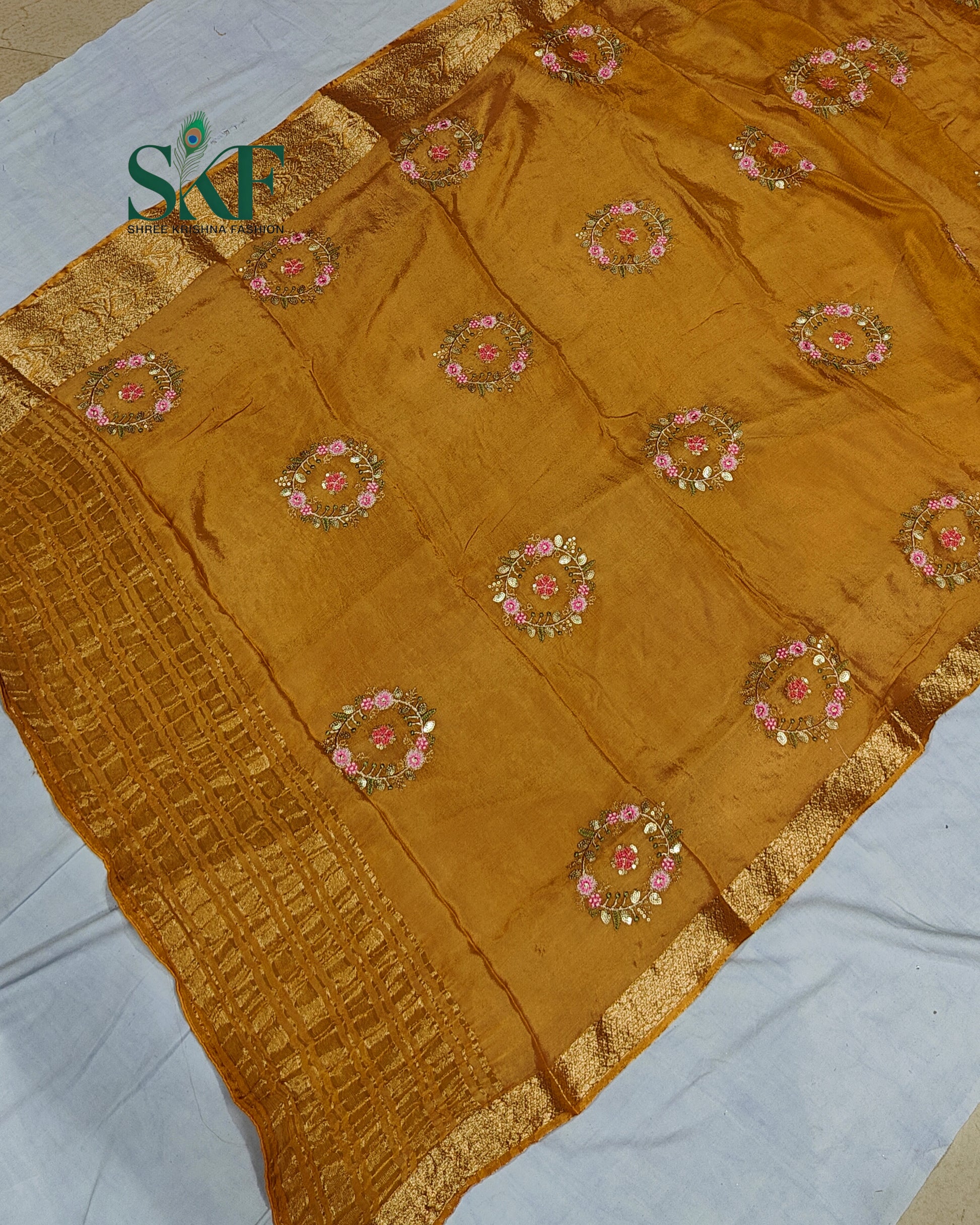 CHINON SEQUENCE EMBROIDERY WEAVING WORK MUSTARD SAREE BY SKFBHOLUBHAI