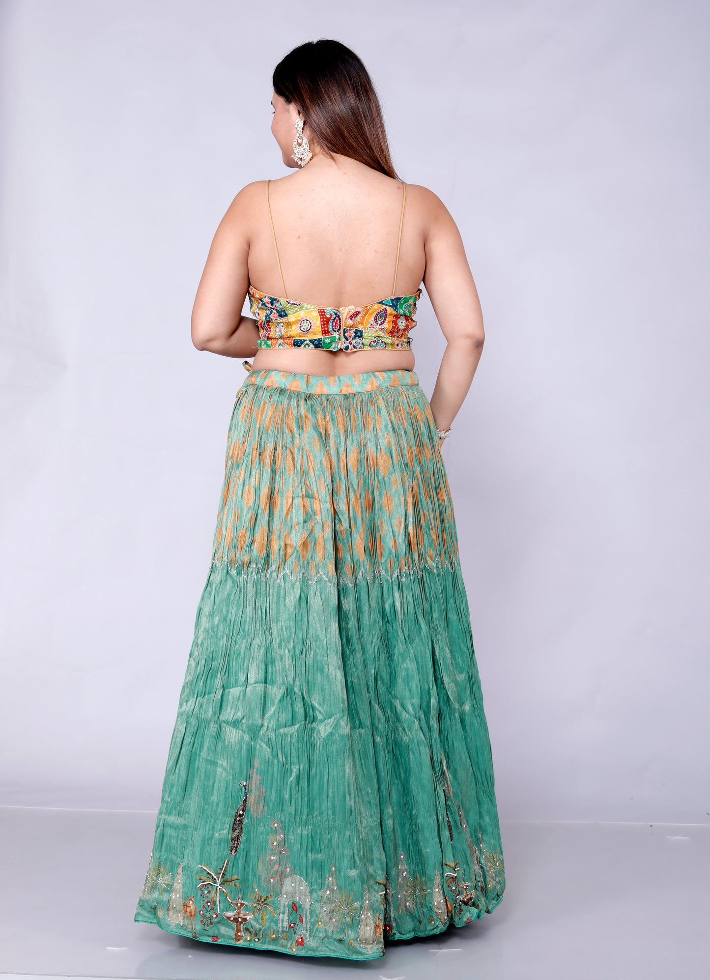 Lehenga: Beautiful Viscose shimmer crush fabric featuring figure digital prints, highlighted with hand pearl and kardana outline work, and cancan inside for added volume