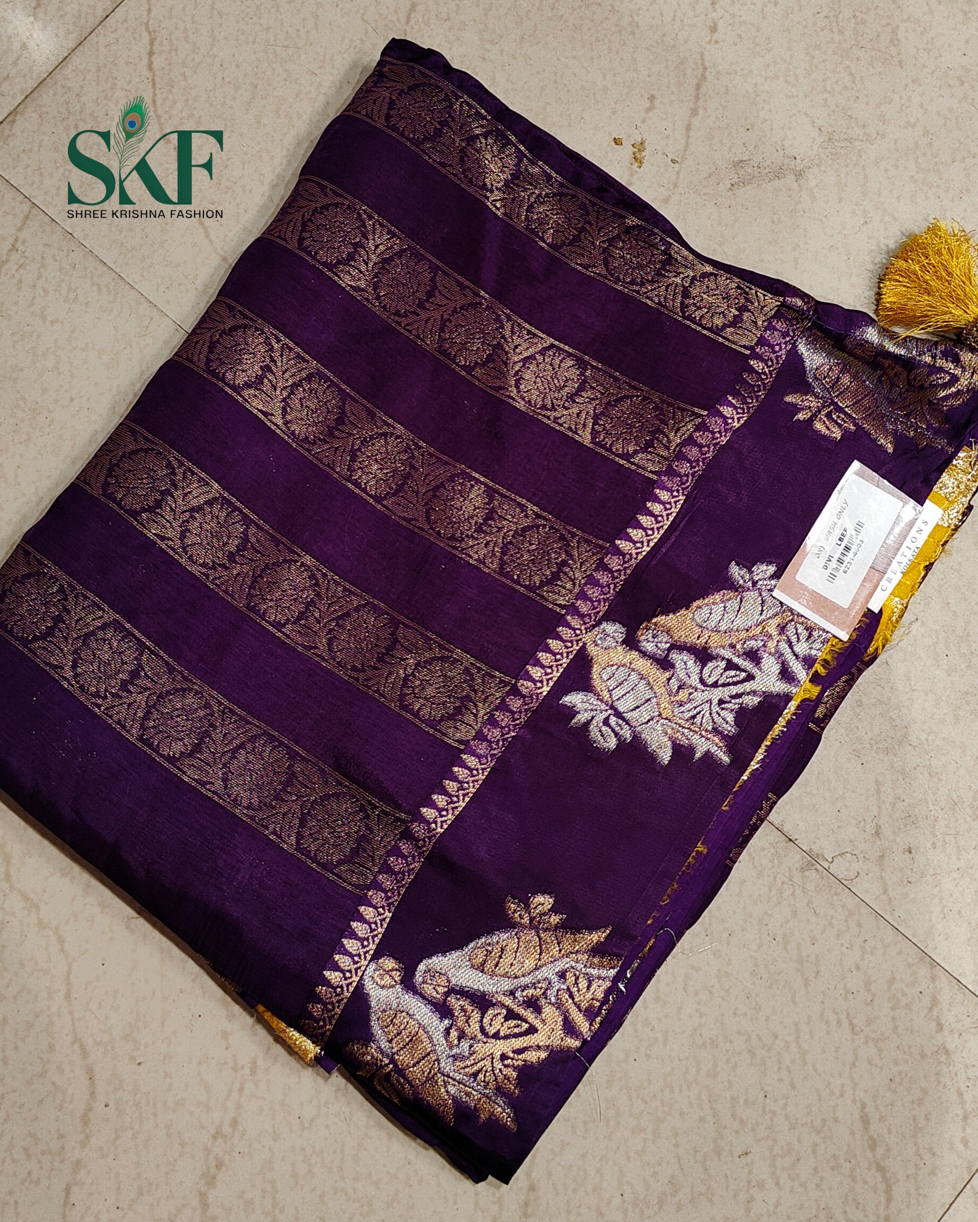 Color: Elegant brinjal purple with eye-catching parrot motif weaving on the border