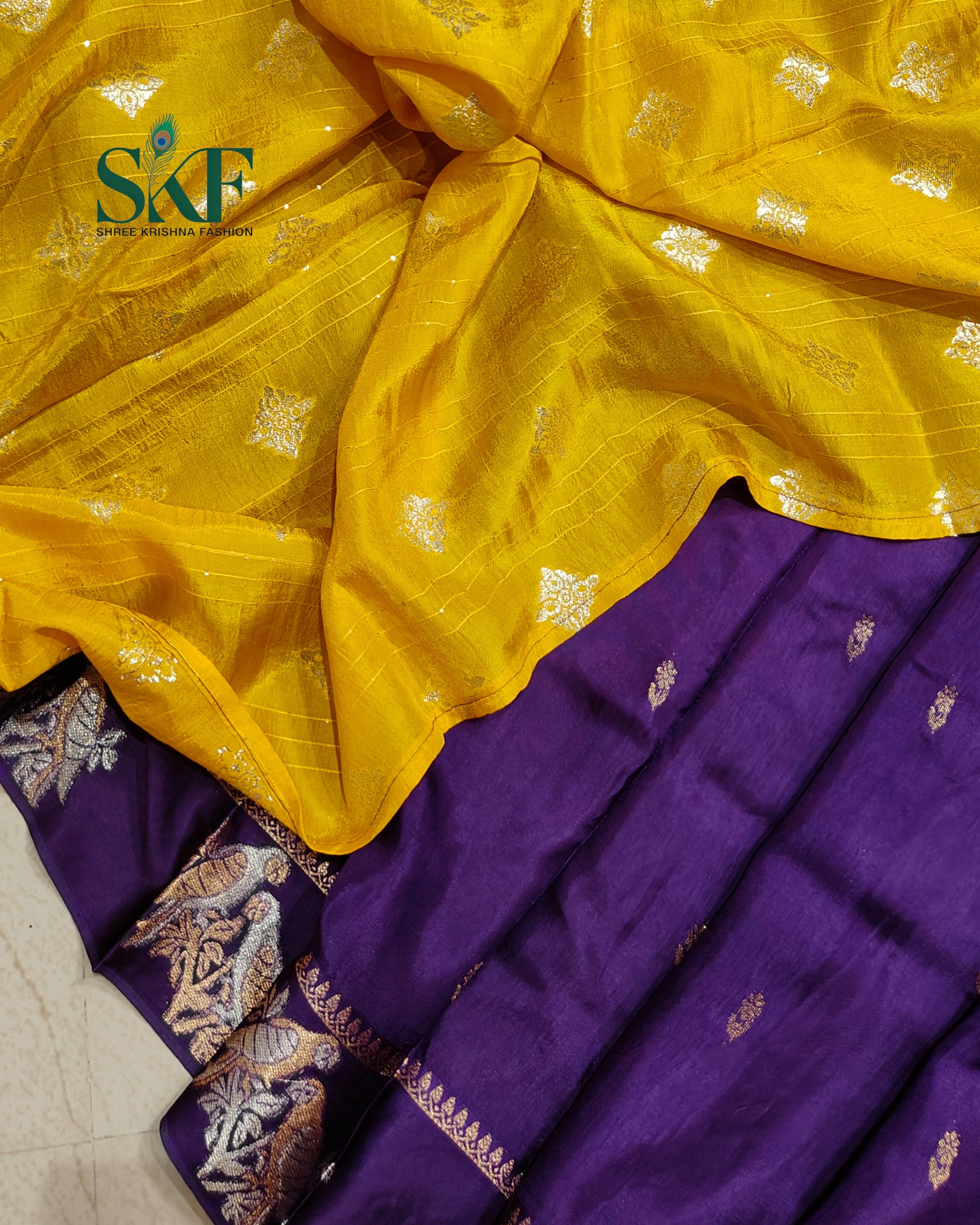 This luxurious Brinjal Purple HO Silk Saree by SKFBHolubhai showcases the richness of traditional artistry with a modern designer touch. Featuring a stunning parrot motif weaving border, a regal zari-woven pallu, and elegant all-over butties, this saree stands out for festive and formal occasions. The contrast blouse with sequence and zari weaving adds a sophisticated finishing touch to this timeless ensemble.