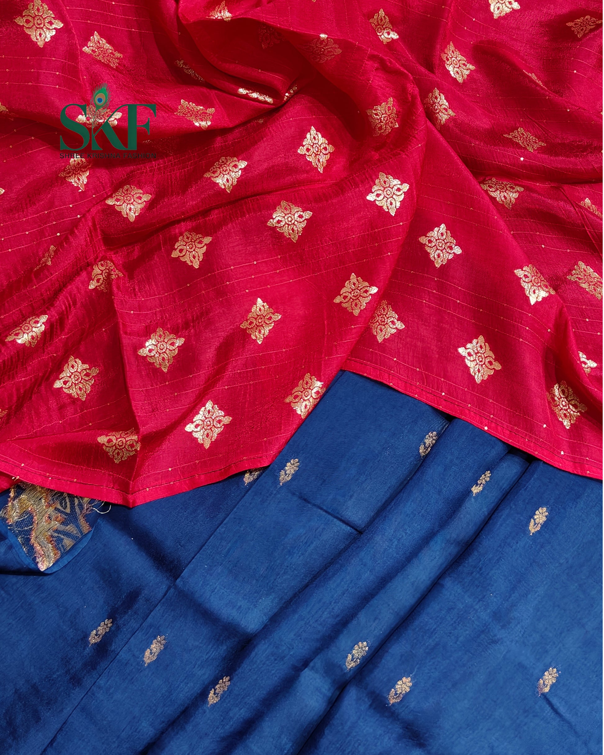 This luxurious Navy BLUE HO Silk Saree by SKFBHolubhai showcases the richness of traditional artistry with a modern designer touch. Featuring a stunning parrot motif weaving border, a regal zari-woven pallu, and elegant all-over butties, this saree stands out for festive and formal occasions. The contrast blouse with sequence and zari weaving adds a sophisticated finishing touch to this timeless ensemble.