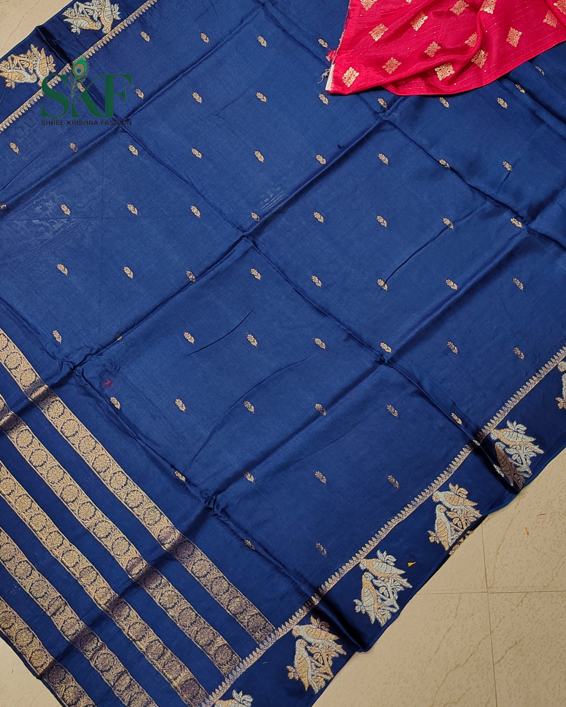 HO SILK PARROT BORDER ZARI BUTTY WEAVING WORK NAVY BLUE SAREE BY SKFBHOLUBHAI