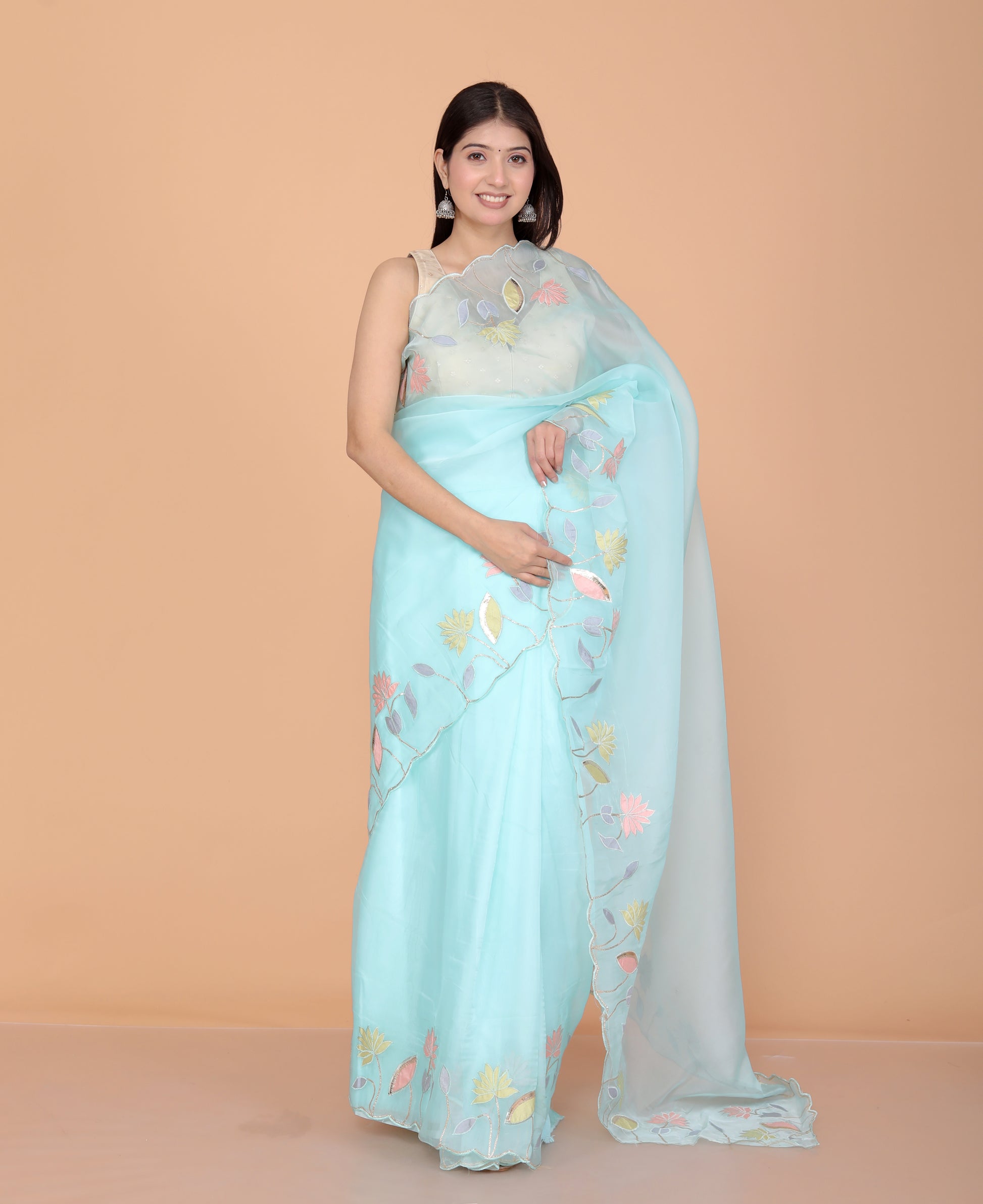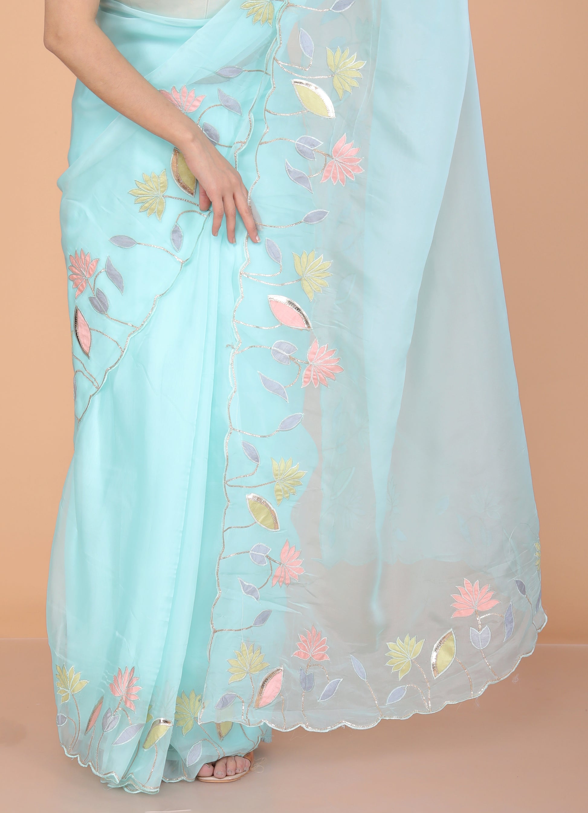 TISSUE APPLIQUE WORK DESIGNER SKY BLUE SAREE BY SKFBHOLUBHAI